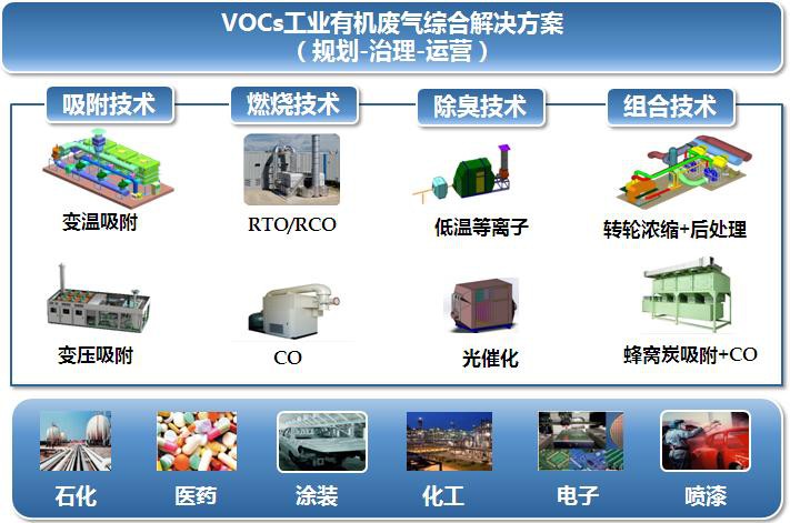VOCs處理方法有數(shù)十種,其原理主要有回收有價值溶劑的回收技術和分解VOCs分子的破壞技術兩大類,實際應用中更多是采用組合式技術。比如:采用濃縮和燃燒結合的技術治理低濃度大風量廢氣,減少裝置投資;采用催化燃燒(CO)或蓄熱式燃燒(RTO)技術實現(xiàn)低能耗下VOCs的處理;根據(jù)VOCs自身溶解度、沸點等特性選擇變溫吸附或變壓吸附進行溶劑的回收,具體如何選擇取決于客戶生產(chǎn)線的工況。