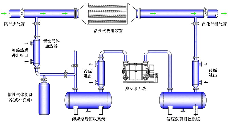 我公司設計生產(chǎn)的活性炭脫附裝置,是根據(jù)不同吸附質的沸點和臨界點,用一定溫度下的惰性氣體將吸附質析出。惰性氣體經(jīng)過加熱器加熱到一定溫度進入飽和活性炭裝置系統(tǒng),惰性氣體將飽和活性炭內的吸附質加熱到沸點,吸附質隨小分子惰性氣體揮發(fā)出來進入冷凝器通過一次冷媒冷凝,大部分吸附質冷凝成液體進入溶媒回收系統(tǒng)氣液分離與惰性氣體分開。物質的吸附量是隨壓力的升高而升高的,隨壓力的降低而降低。含有少量吸附質的惰性氣體經(jīng)真空泵減壓后進入二次冷凝器,經(jīng)二次降溫冷凝將少量的吸附質分離回收。處理后的惰性氣體再經(jīng)干燥器干燥,加熱器加熱進入活性炭吸附裝置,循環(huán)使用。在實際工作中,這種方法也是常用的脫附方法。